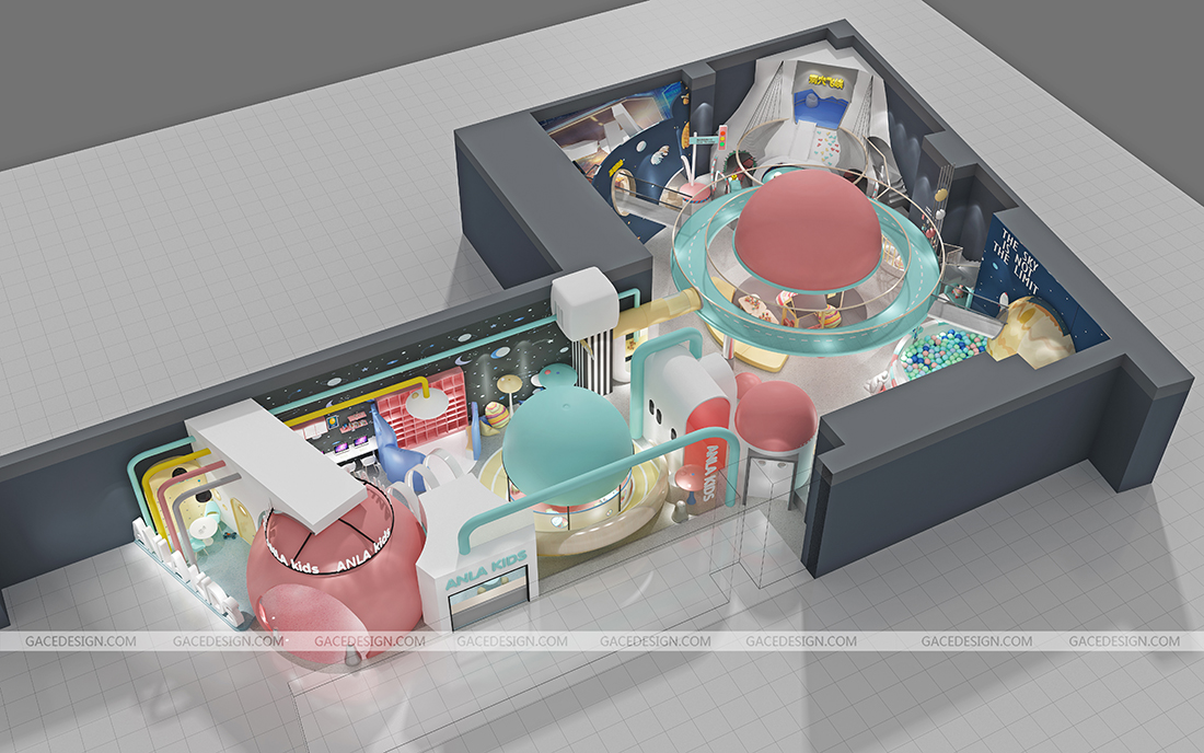 設計師將游樂場主題定為“未來星球”,以“未來”作為設計方向,以“星球”做為設計的核心。各種體量的“星球”在太空中穿行,打造出豐富多彩的星球世界。設計師根據孩子的冒險精神設定多種游戲玩法和路線,孩子進入游樂場后,首先需要了解故事背景,在置身其中不斷迎接挑戰,最終完成“拯救家園”的任務。整個游樂場分為前端接待區、中端靜態游戲區、后端動態游戲區。