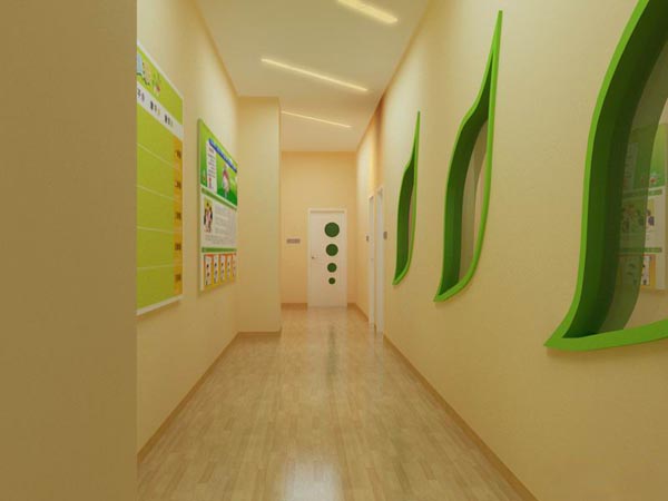 地面至1.2米處也可鑲貼瓷片,一是方便清潔,二可以增添幼兒園特色的氛圍,還可以掛上一些可供幼兒寫畫的小黑板,便于幼兒表現(xiàn)自我、抒發(fā)內(nèi)心感受。裝飾墻面的材料顏色要淡雅、明快,要考慮環(huán)境的功能性以及采光情況。可用貼或刷的方法,裝飾出大塊的抽象圖案。幼兒園設計整體色彩既要注意統(tǒng)一,又要強調(diào)變化,體現(xiàn)幼兒園特點。