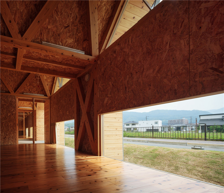 “T-nursery”這個(gè)名字完美詮釋了組成這個(gè)項(xiàng)目的三大支柱概念:木材、構(gòu)架及梯形形式。這座幼兒園位于福岡郊外,為方便日后擴(kuò)建等改動(dòng),由一系列重復(fù)的模塊組成。外圍墻面由荷載支撐結(jié)構(gòu)組成,支撐了跨度9米的無柱空間,方便各種用途(游戲室等)的轉(zhuǎn)換。為室內(nèi)空間提供最大限度的靈活性。木桁架梁在工廠安裝,用拖車運(yùn)送到施工現(xiàn)場。復(fù)雜的連接也是在工廠制作的,只有一個(gè)相對(duì)容易的連接在現(xiàn)場組裝。這樣的方式提高了施工精度,縮短了施工工期。