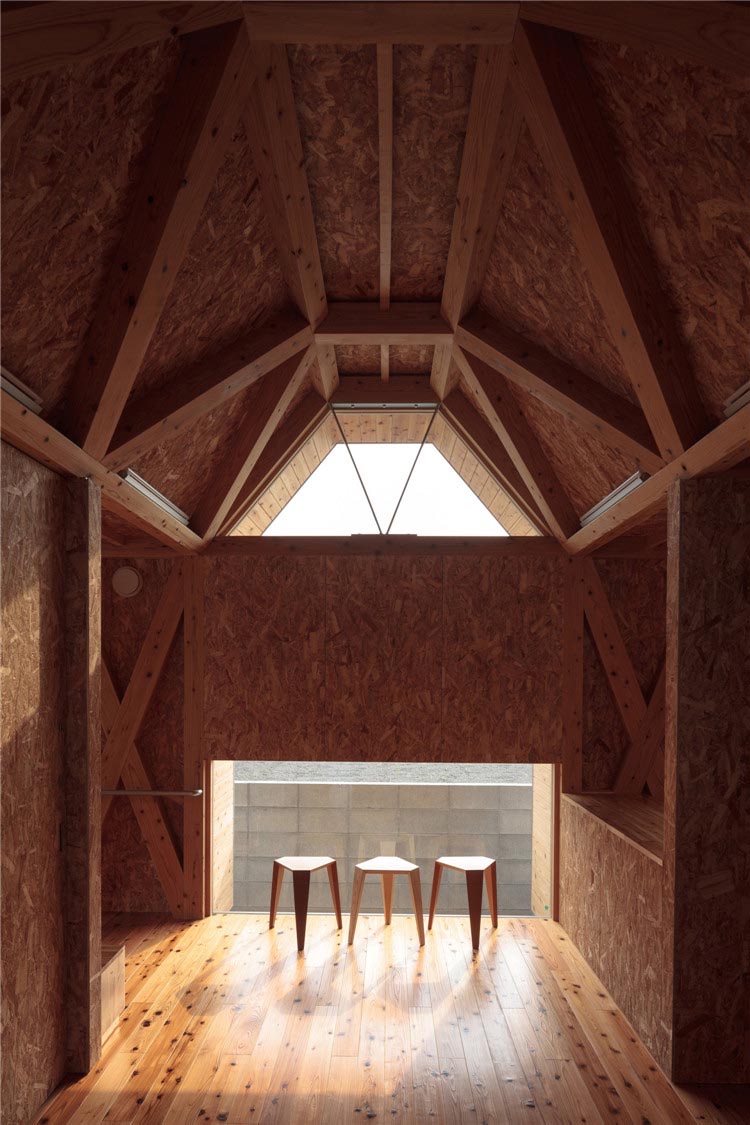 建筑的所有結(jié)構(gòu)不是天花板就是墻體,木桁架梁傾斜設(shè)置,是屋頂?shù)幕A(chǔ)結(jié)構(gòu)木構(gòu)件。這樣的設(shè)計(jì)滿足了客戶對(duì)于“保育室被木頭包圍”的要求,減少了建設(shè)成本。此外,通過降低天花板的高度,木材長度被縮短了,對(duì)空調(diào)的需求也降低了。由于天花板幾何形狀不規(guī)則且窗戶為梯形,因此雖然天花板最低的地方只有2.2m左右,但即使是成年人也不會(huì)感到壓抑。