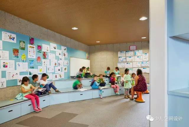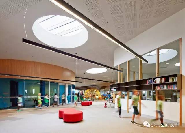 由于材質(zhì)面板呼應(yīng)色彩鮮亮的學(xué)生作品和家具,學(xué)校顯得熱情好客和溫暖;深色調(diào)與寬闊的玻璃相結(jié)合,增強(qiáng)了設(shè)施的透明度。大量插件板用于墻壁、地板和天花板,在廣泛的聲學(xué)處理中發(fā)揮關(guān)鍵作用,這是混合學(xué)習(xí)空間里必不可少的。(幼兒園設(shè)計(jì))