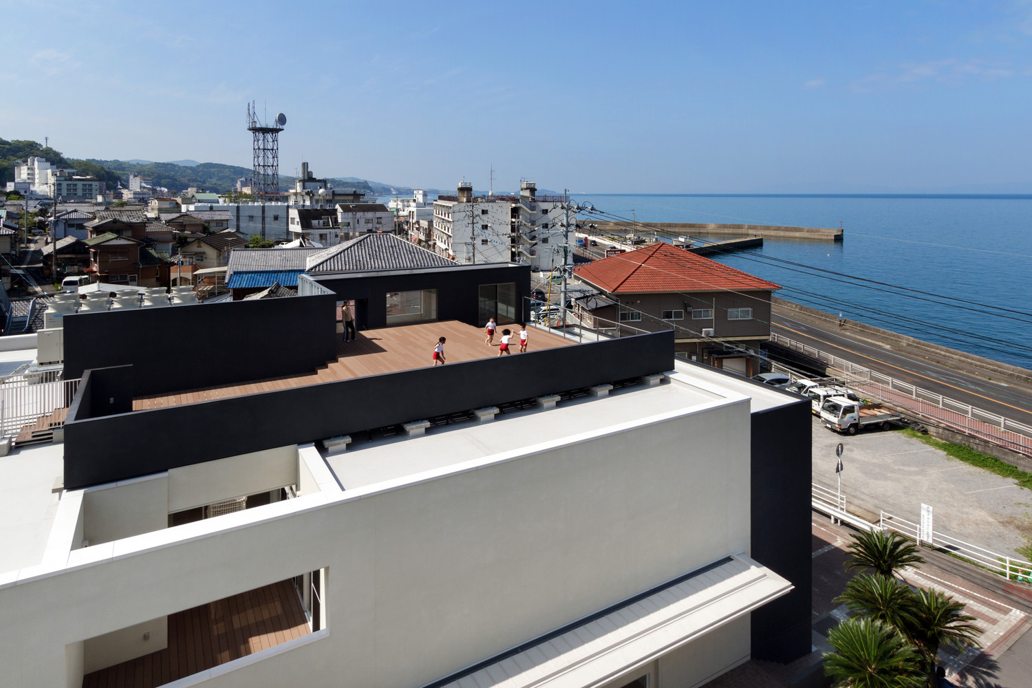 在日本長崎縣有一所幼兒園,就像海子的詩(面朝大海春暖花開)一樣,是一座面朝大海的建筑,這個幼兒園建于里亞式海岸旁。一望無際的海面向南方蔓延,在幼兒園樓頂上看向大海的南方有座山,這是一座能使人們感受到大自然神奇的創(chuàng)造力秀麗山峰。幼兒園的建筑高12m,室內寬敞明亮設計師充分利用臺階的優(yōu)勢,解決兒童因身高限制而無法觸到和看到的高度問題。該建筑布局和流程圖是根據交通和兒童保育計劃特別設計的。