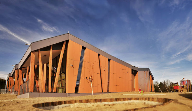 在斯洛文尼亞戈里采丘陵地區中心的一個名叫Cerkvenjak的小鎮,建在山脊之上,是一座獨立的采用獨特的低延長式設計與斜坡式的房頂結構,坐落在山脊之中,更顯出幾分傳統建筑韻味的幼兒園。
