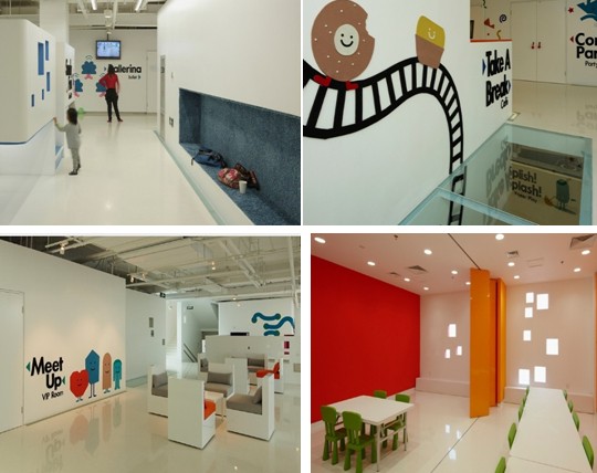 許多的空間設(shè)計都非常合理、實用而且美觀。兒童休息區(qū)設(shè)計為有長格子形狀的毛茸茸長椅,根據(jù)兒童的身高尺度來設(shè)計,小比例的空間使內(nèi)部更加豐富。咖啡廳與派對室設(shè)計了透明的地板,能清楚的告訴小朋友,下邊還有東西,能激發(fā)孩子探索欲望的積極性,打破了地板的界限。家長休息室根據(jù)大人的人體比例設(shè)計了舒適的座位,家長之間更方便交流孩子學(xué)習(xí)之間的心得體會,休息室顯得格外可愛、溫暖。小食堂的設(shè)計,在內(nèi)部這些墻面上采用了模擬自然陽光的技術(shù),用以彌補采光不足。整個空間處處都體現(xiàn)了小盒子的造型,這些空間設(shè)計都是很溫馨、浪漫的。(幼兒園設(shè)計)