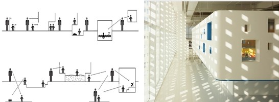 設(shè)計師首先考慮到兩種身高帶來的視角區(qū)別。因此在兒童內(nèi)部空間中設(shè)計一些專供兒童使用的低矮空間。就如同我們小時候爬假山的山洞,或者拿沙發(fā)墊子搭的城堡。另一方面父母還必須負起監(jiān)護的職責(zé),所以主要活動室的設(shè)計升高到成人目光可以透過窗子平視的高度。這樣就更有利于家長觀察孩子的動向,設(shè)計師最終在大空間內(nèi)部搭起一系列“小盒子”。呈現(xiàn)出升高的教室,供家長窺視的小窗,還有盒子底下只有孩子才能鉆過去的通道。我相信小孩們總會對這種特別的兒童空間設(shè)計感到興奮和安全感。