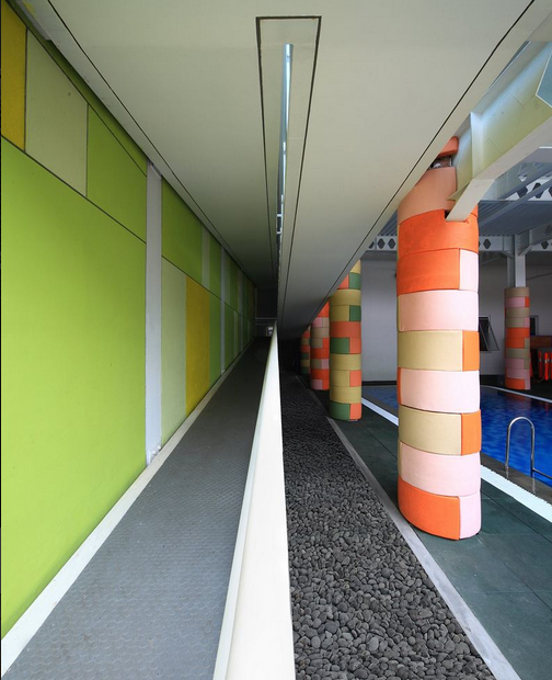 這個建筑的設計處處為孩子們的安全著想。園長的辦公室專門設置在一樓,臨近操場和游泳池,這樣可以方便園長監控孩子們活動時的安全。操場的地面采用了1.5厘米厚的橡膠材質做地板,游泳池被欄桿圍了起來,以防止孩子們發生安全事故。(幼兒園室內設計)