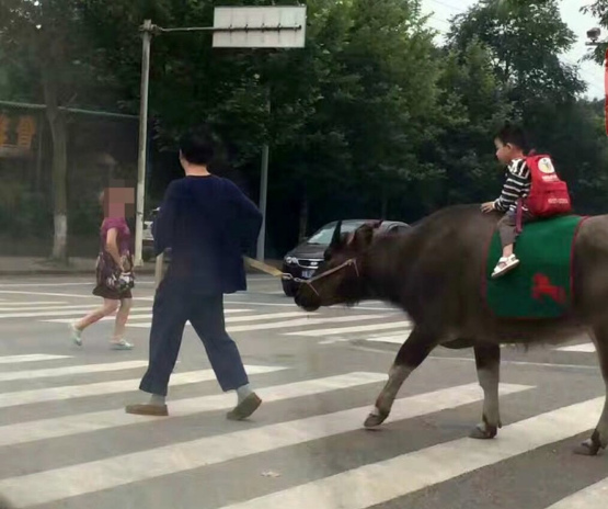 近日成都一位父親登上了熱搜,其原因是一個小娃娃背著書包坐在一頭黑色大牛背上,前面一名中年男子牽著牛走著。讓路人很是好奇。
