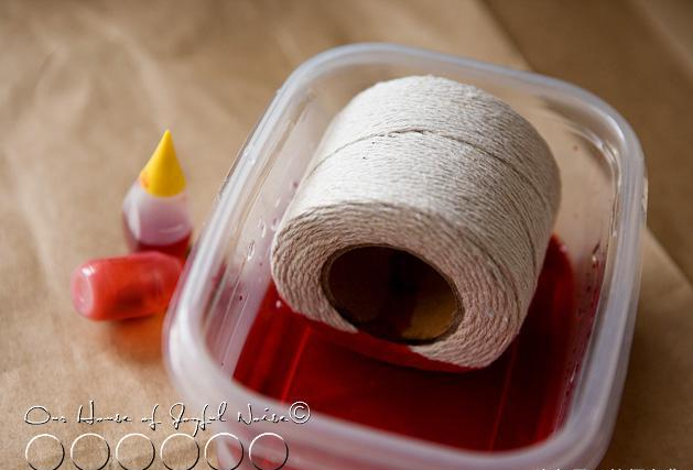 將食用色素放在不同的容器中加入水調(diào)和(黃色和橙色),線軸的不同側(cè)面浸泡在食用色素溶液中。(老師們也可以直接用絲帶代替)