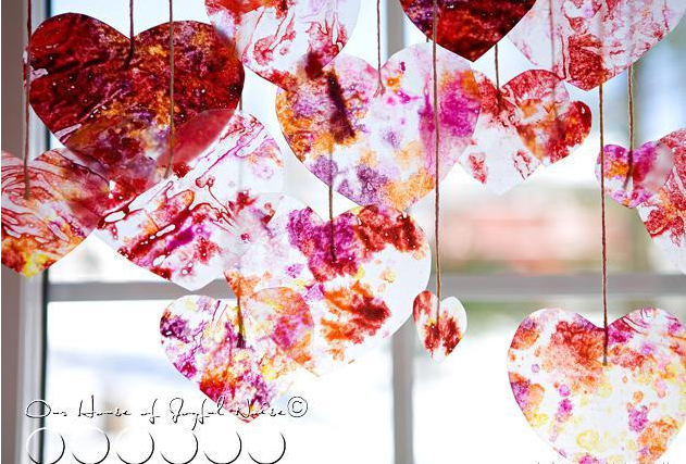 直接用透明膠帶將心形圖案粘貼在窗子上,當(dāng)陽關(guān)透過窗子照進(jìn)教室時,會非常的漂亮。