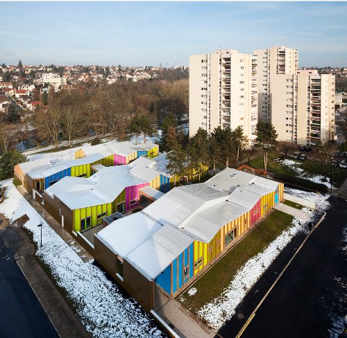 這是由法國事務(wù)所ECDM設(shè)計的一個托兒所項目,它呈現(xiàn)出起伏的混凝土墻壁,這種漣漪的效果是通過采用一系列的預(yù)制板面形成的,它們環(huán)繞建筑的三側(cè),只有一側(cè)包含開口的窗戶。一個院落位于兩層樓的中心,周圍環(huán)繞為孩子們準備的房間,可以容納66名孩童。一個樹形的金屬傘遮擋結(jié)構(gòu)為院落提供遮陰,從街道看去好似漂浮在屋頂之上。