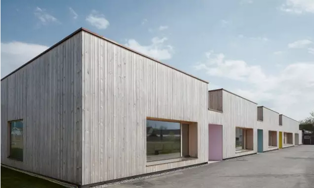 集合少兒設計機構分享:目前幼兒園正在準備向東北方向擴建,為了尊重原有建筑的設計并保持與它空間上的聯系,擴建部分與老建筑完全獨立,形成了一個20米寬,65米長的全新木制空間。像毛毛蟲一樣,建筑物用重復、特定的韻律感在小溪邊展開。外立面垂直的木板條會隨著時間變化而優雅地老去,與景觀和諧共存。與建筑一側的就空間一樣,新的幼兒園使用了同樣貼近低矮的、貼近地面的設計。每個模塊中間都有大的方形窗戶,在視覺上形成了整體的效果。建筑前部的門廊形成了一個半室內的“停車場”,為孩子們的腳踏車和其他游戲提供適合的場地。