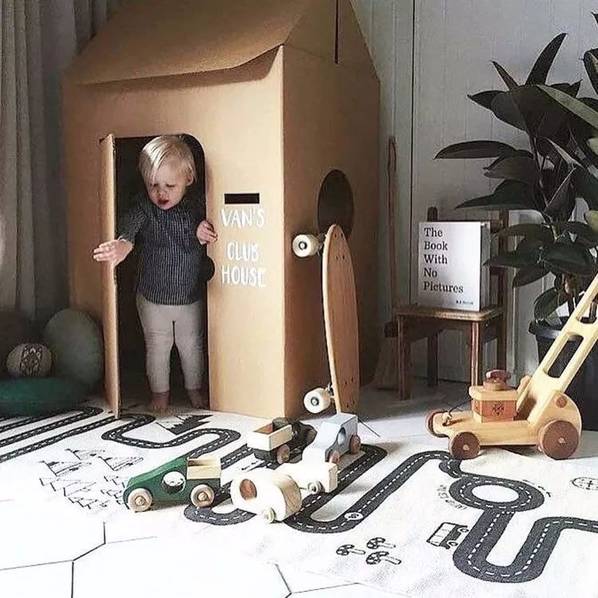 房間里還可以設置一些簡易的玩樂設施。1-3歲的孩子需要父母的時刻陪伴,我們可以在房間或者客廳放上爬行墊+安全圍欄給孩子一個小區域領地,把這里變成一個親子小游戲區。在兒童房里也可以在地面貼上玩具貼紙,把局部地面變成孩子的游戲地圖,適合在游戲中培養孩子創造力和分享的意識,留出空間,讓孩子可以和朋友或者和父母一起玩玩具,孩子1歲之后我們可以適當添置一些矮柜來收納玩具,還可以讓孩子扶著學走路。在兒童床上加一個木架結構,把床做成木房子,給孩子一個開放的獨立空間。這種具象的區域不僅會給孩子安全感,還能滿足他們的探險欲,