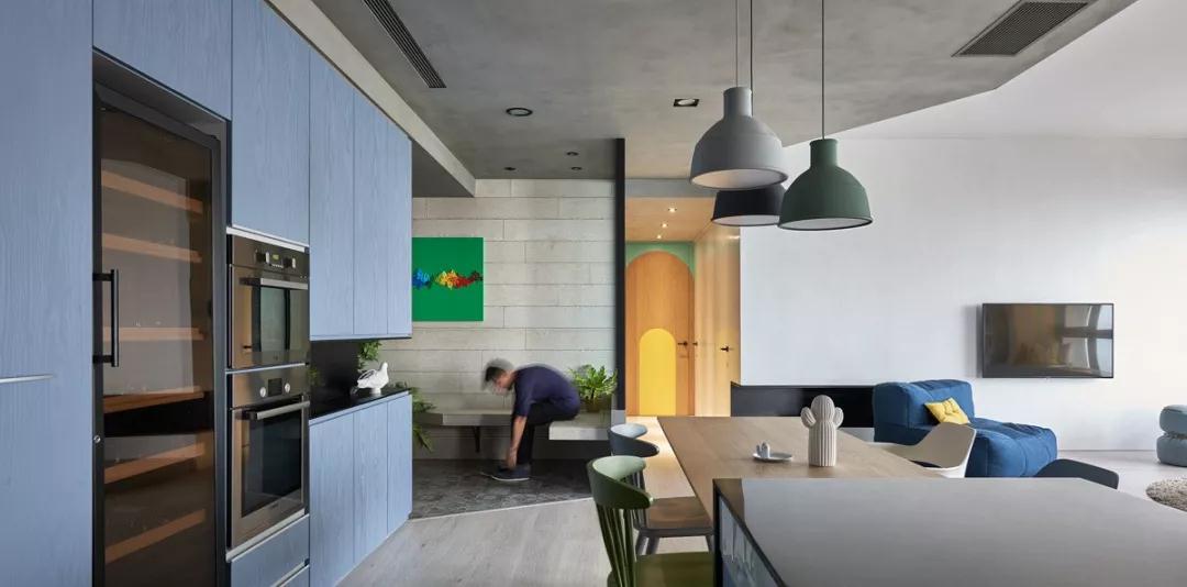 孩子們的房間,而不是大多數(shù)父母通常選擇的粉色,以滿足他們年幼的女兒,門和櫥柜的特點(diǎn)是生動(dòng)的,中性的顏色,藍(lán)色,綠色和黃色,這些顏色與混凝土墻的灰暗色調(diào)完美地配合。